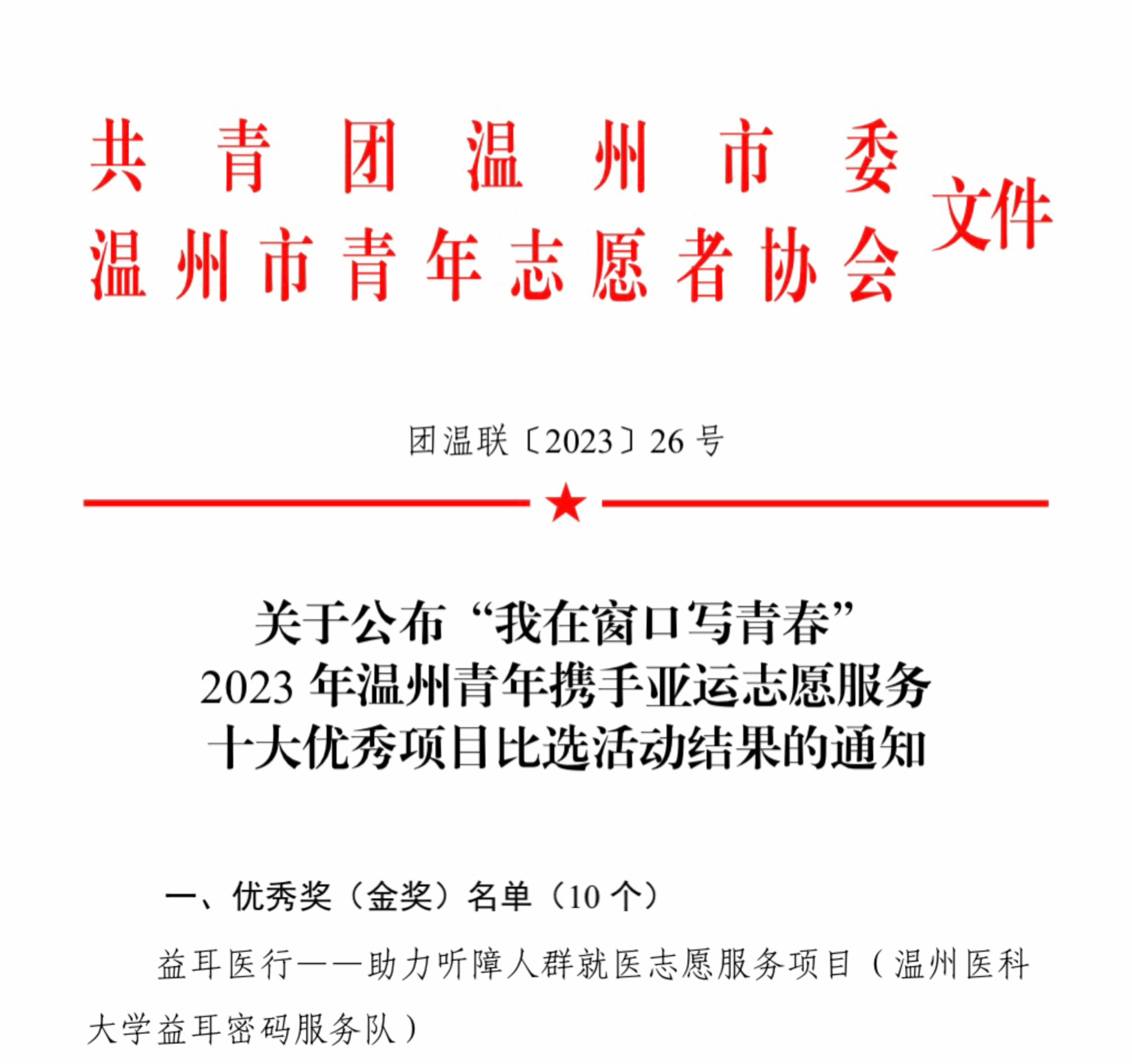 益耳医行——助力听障人群就医志愿服务项目依托温州医科大学益耳密码志愿服务队,发挥校内本硕博青年学生及学校学科优势、医疗资源充足等特色,围绕听障人群及其家属和听力障碍潜在人群,开展就医全过程就诊陪诊、多途径宣传益耳知识等活动,致力于提高民众的听力保护意识和全民用耳大健康的能力,目前已获听障人群、医院、政府等多方认可。项目实施至今受益人数超20万,科研成果获国家级省级荣誉10余项,并且得到学习强国、光明日报、浙江教育报、中国大学生网等媒体报道,取得了良好的社会反响。