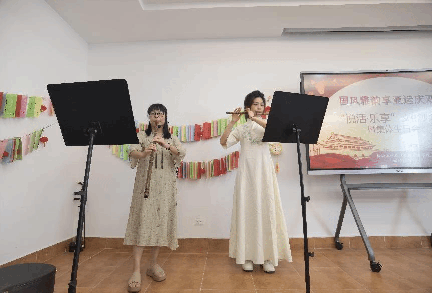 活动开始,教职工们准备了不同风格的才艺表演。施孟如老师和学生笛箫合奏了一曲《铁血丹心》,笛声悠扬,箫声呜咽,豪迈与缠绵交织,大家都沉浸其中。