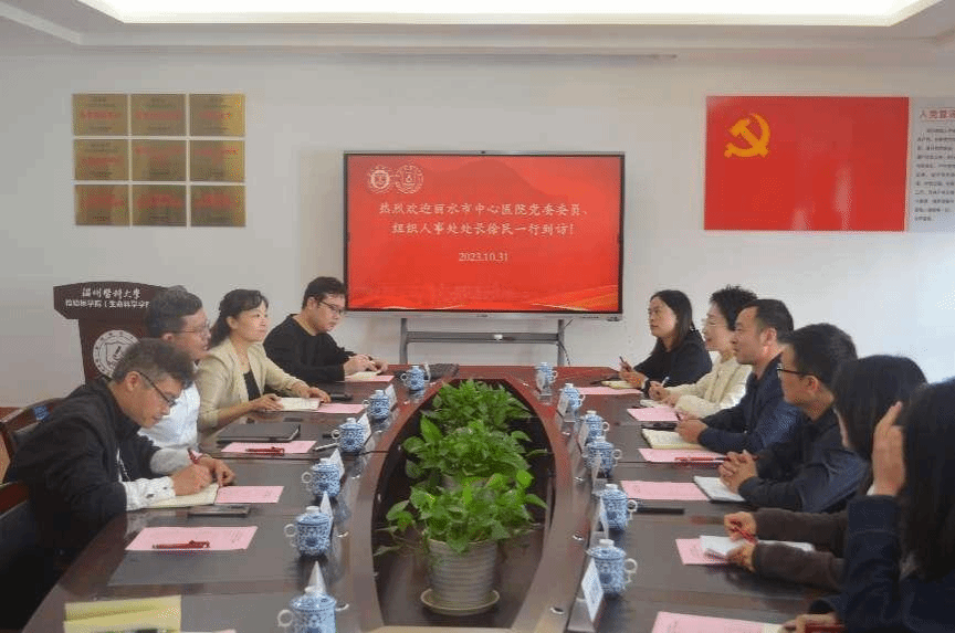 郑晓群执行院长对徐民委员一行的到来表示欢迎,并从学院基本情况、学科建设、专业建设、科学研究、人才培养等方面介绍了学院历年来取得的成果;徐民委员介绍了丽水市中心医院的发展历程、基本情况以及学科建设情况与人才培养现状。