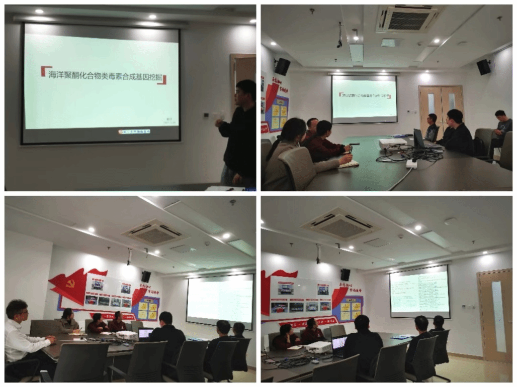 2023年11月14日下午,求真讲坛(院内专场)系列讲座之“海洋聚酮化合物类毒素合成基因挖掘”在生物医药科研大楼南702会议室举行。讲座由陈亨博士主讲,黄海山副院长主持,学院青年科研人员参加了本次交流。