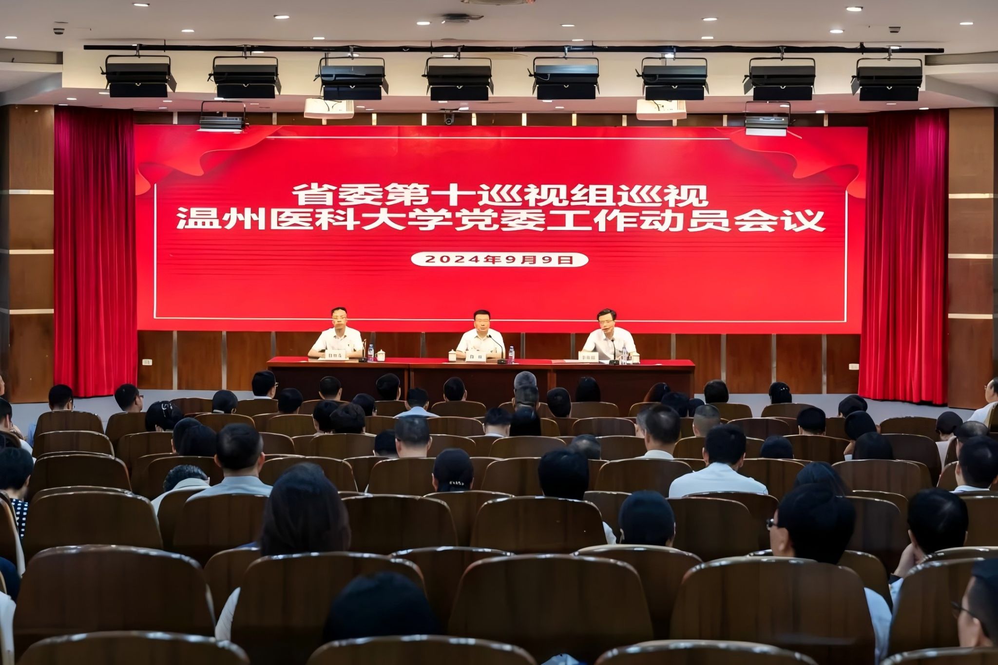 根据省委统一部署,2024年9月9日下午,省委第十巡视组巡视温州医科大学党委工作动员会议召开。会上,省委第十巡视组组长陈灿作了动员讲话,对深入学习贯彻习近平总书记关于巡视工作重要论述,全面落实党的二十届三中全会精神和省委十五届五次全会精神,高质高效完成好省委第五轮巡视工作提出要求。温州医科大学党委书记金焕民主持会议并作表态发言。