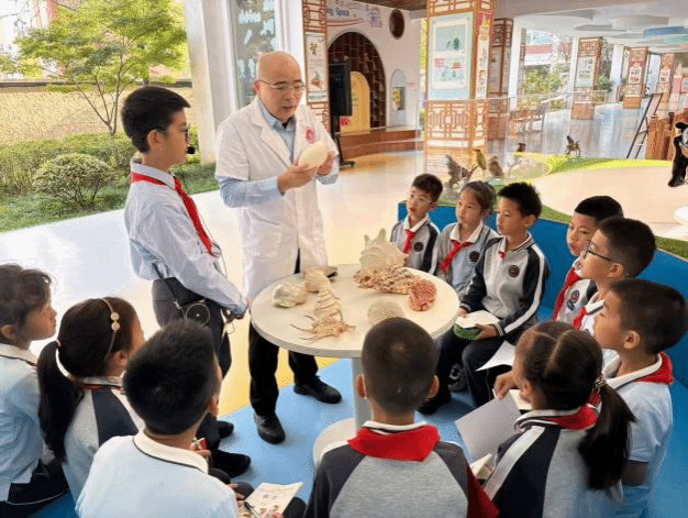 在此次科普宣讲活动中,艾老师凭借多年科学研究经验以及课堂教学经验,通过介绍贝类、鱼类等多类标本的制作及储存方法,阐述各类生物形状、颜色等方面的异同,将深奥的科学知识具象化,引起了学生们对生物多样性保护的关注。温州大学城附属学校的小学生们从海螺中听见了海浪的声音,明白了工业酒精可以替换福尔马林,在这生动且有趣的一课中,对海洋生物的研究产生了浓厚的兴趣。本活动让学生们不仅能近距离感受科学的趣味,也对海洋生物的多样性和重要性有了更深的理解,激发了他们对自然科学的兴趣。活动增强了同学们对生物多样性保护的意识和科学探索精神。