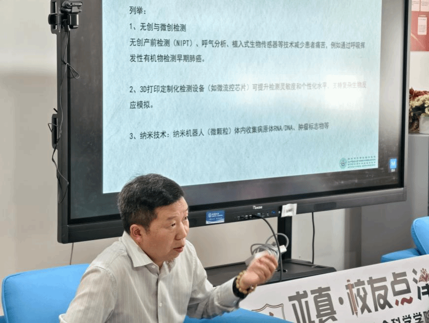 在同仁楼7A318会议室举办“求真·校友点津”分享会,此次活动特邀1989届医学检验专业校友、温州市中西医结合医院检验科兼输血科主任何卫,副院长楼哲丰和师生代表参与活动。