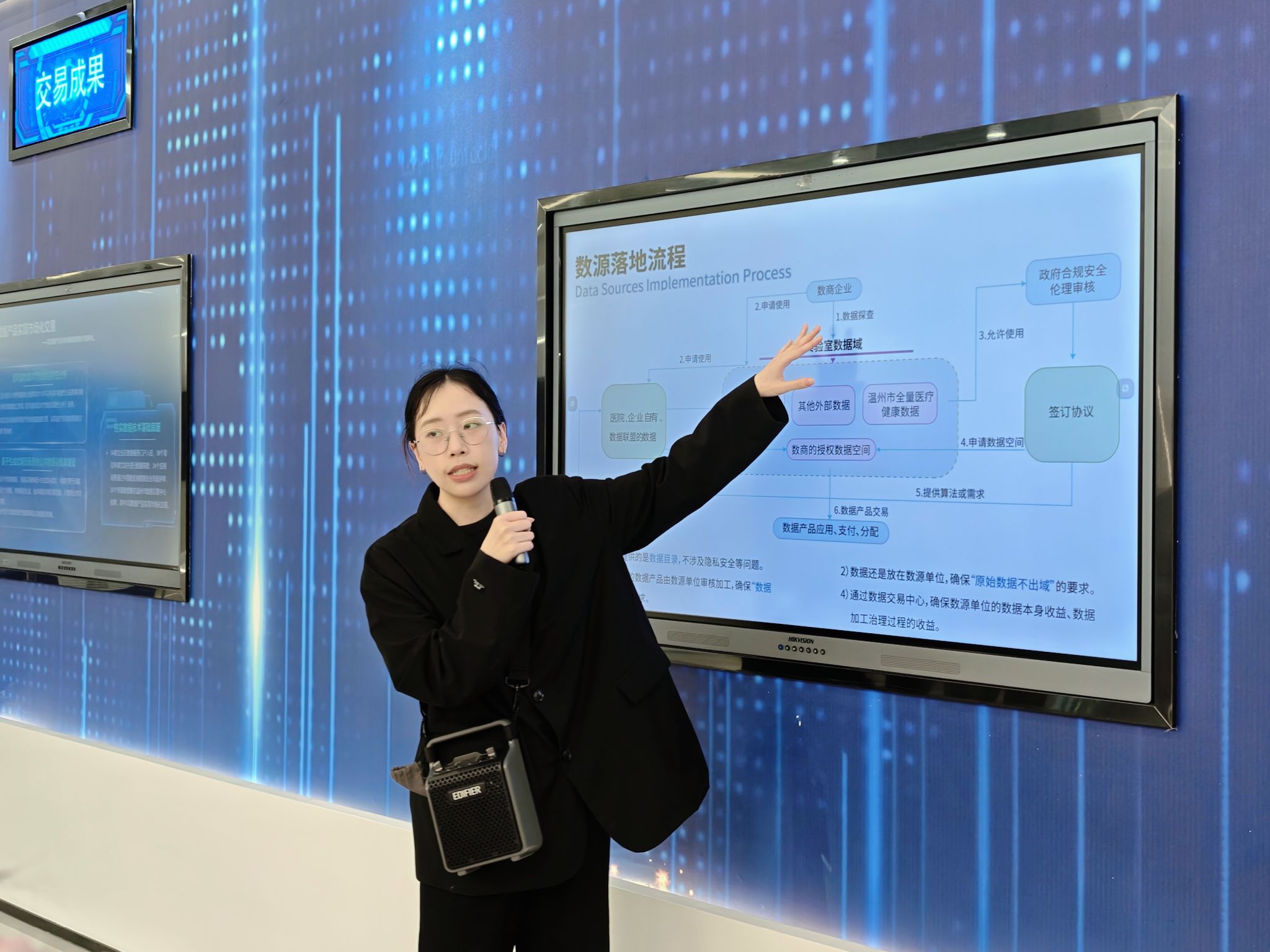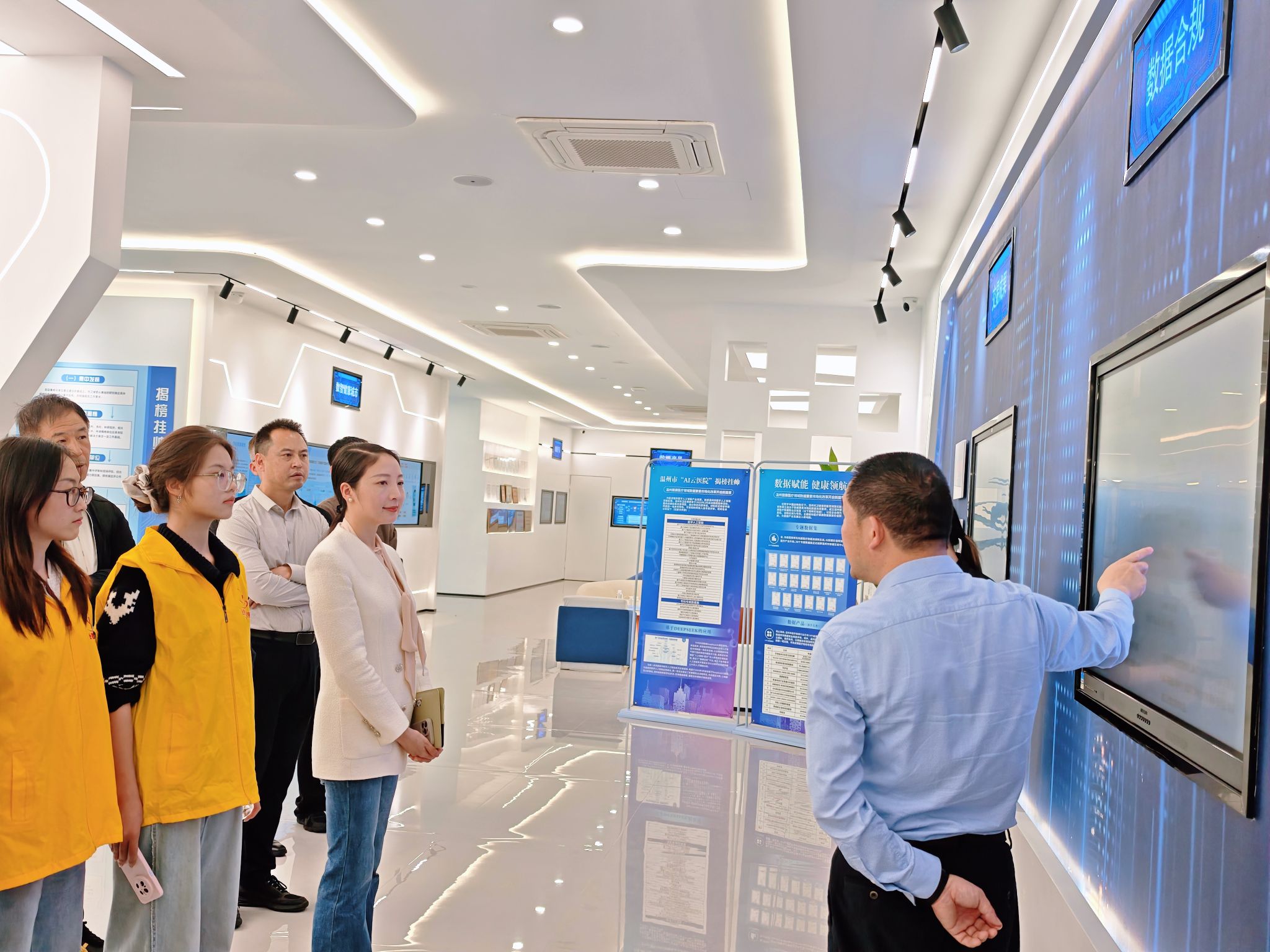 在数安港工作人员的引导下,师生一行参观了数安港联合实验室主展厅,系统了解温州以数安港为依托,构建 “九个一” 数据安全与要素流通体系、承接国家(温州)健康医疗数据联合实验室建设、深化医疗健康数据要素市场化配置与成果转化的创新实践,直观感受温州在数据安全治理、可信数据空间、医学 AI 评价评测等领域的前沿布局与 “温州经验、温州样板” 的实践成果。