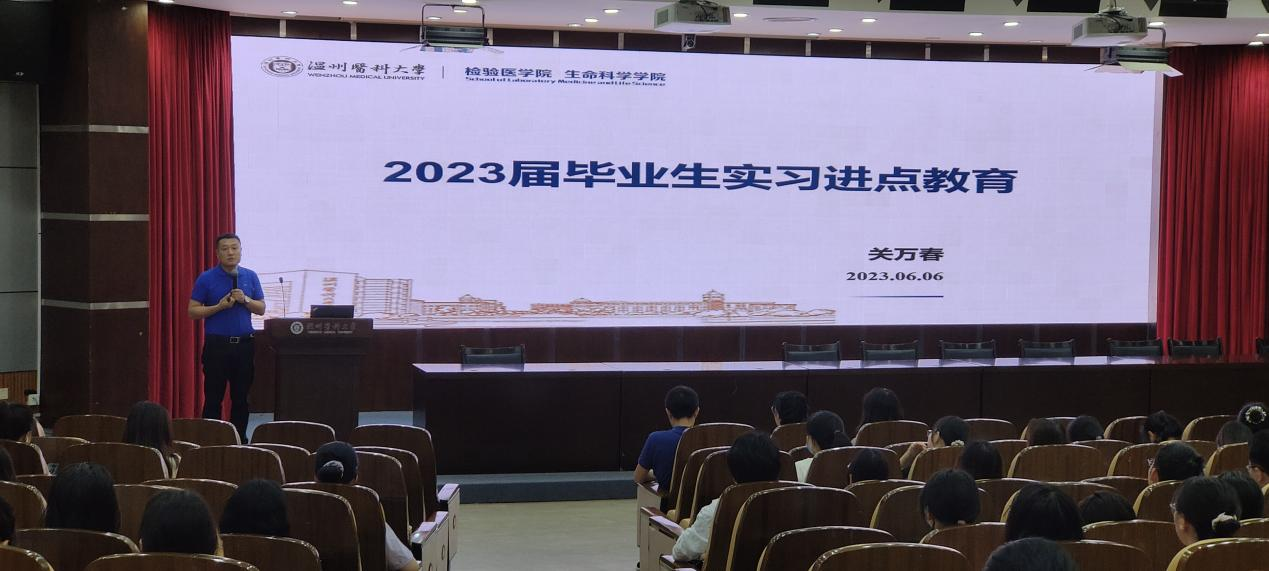 在旭光厅举行毕业生实习进点教育大会。2022届医学检验技术(含仁济)、卫生检验与检疫、生物技术等专业全体学生、辅导员、教学办老师参加了此次会议。会议由教学办副主任陈晨主持,学院教学副院长关万春出席会议并作重要讲话。