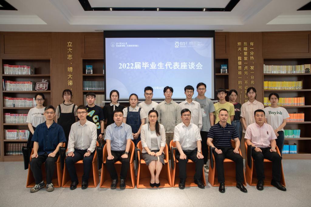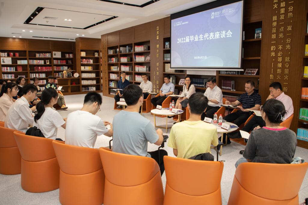 在图书馆青春之书房举行2022届毕业生代表座谈会,学院党委书记管素叶、执行院长郑晓群携党政班子全体成员与省优秀毕业生、校友联络员欢聚一堂,共叙情谊。