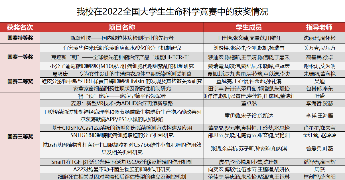 22支队伍获得省赛奖项;全校16支队伍晋级2022全国大学生生命科学竞赛,其中大象传媒