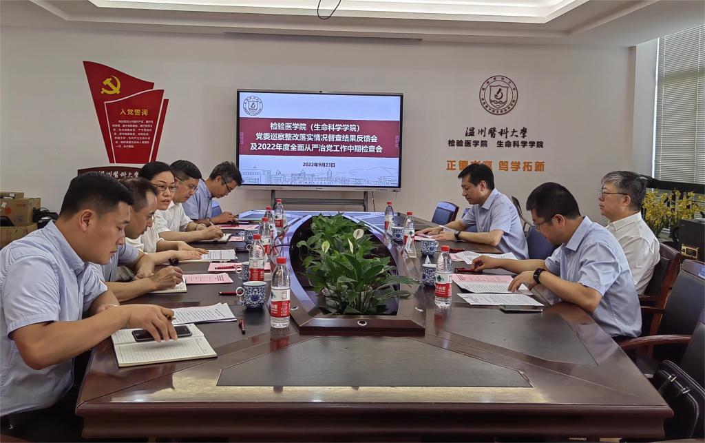 于3A320会议室召开党委巡察整改落实情况督查结果反馈会及2022年度全面从严治党工作中期检查会。校长李校堃、校纪委副书记、纪检监察室主任戴向龙、督查组组长陈浙及学院全体领导班子成员、各科室负责人参加会议。学院党委书记管素叶主持会议。
