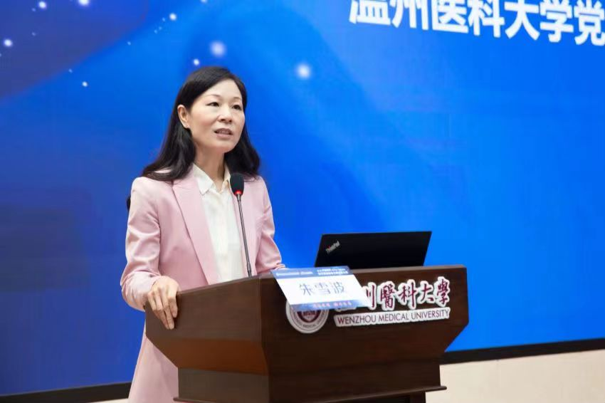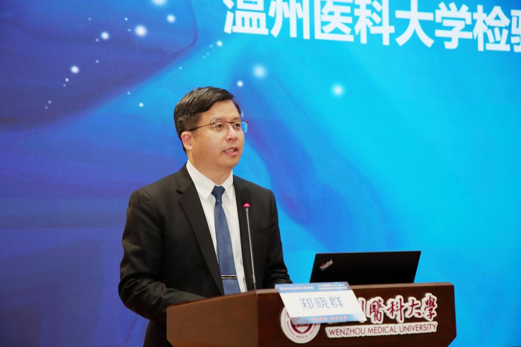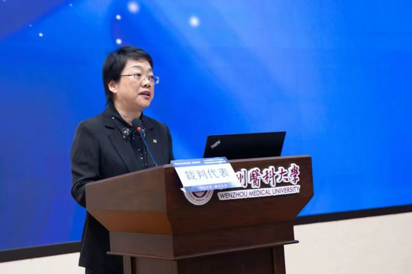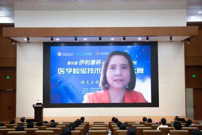 温州医科大学党委委员、教务处处长朱雪波教授致欢迎词,她表示,温州医科大学一直秉承“仁肃勤朴,求是奋发”的校训,把促进学生的健康成长,培养学生的创新思维,夯实学生的职业技能作为人才培养和教育教学的出发点和落脚点。近年来,学生在各个赛事取得优异成绩,学校检验技术专业水平在全国一百多所高校中名列前茅,在其他方面也成绩斐然。本次大赛将以“精益求精,助力未来”为宗旨,注重学生的创新思维的培养,科研意识的强化和专业技能的提升,践行总书记在二十大报告中提出的“培育创新文化、弘扬科学家精神、涵养优良学风、营造严谨氛围”的精神要求。部分比赛于伊利康生物技术有限公司举行,体现人才培养当中与行业职业相协同的新时代要求。作为承办单位的东道主,我们将严格要求,竭尽全力做好服务保障工作,期待同学们赛出成绩,赛出风采。