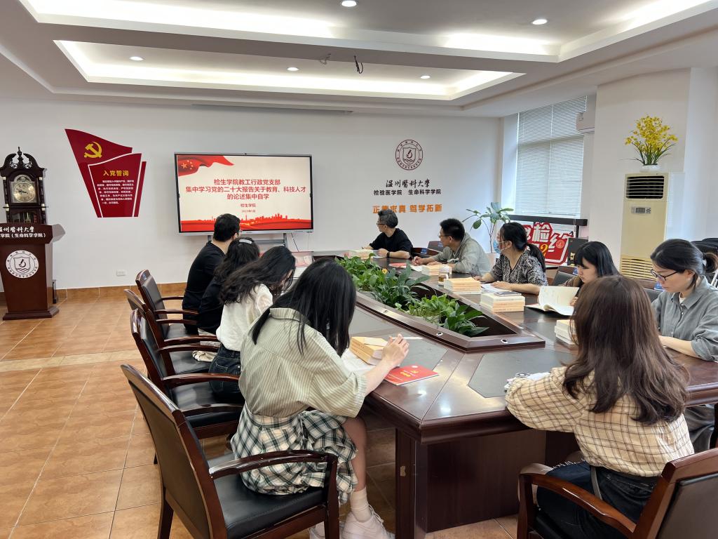 学院行政党支部、生物化学与分子生物学系党支部、卫生检验与检疫学系党支部和病原生物学与免疫学系党支部等第一时间组织支部党员集中学习党的二十大报告、党章、《习近平著作选读》和《习近平新时代中国特色社会主义思想专题摘编》等,通过学思悟践,坚定理想信念、提高理论素养、升华觉悟境界、增强能力本领。