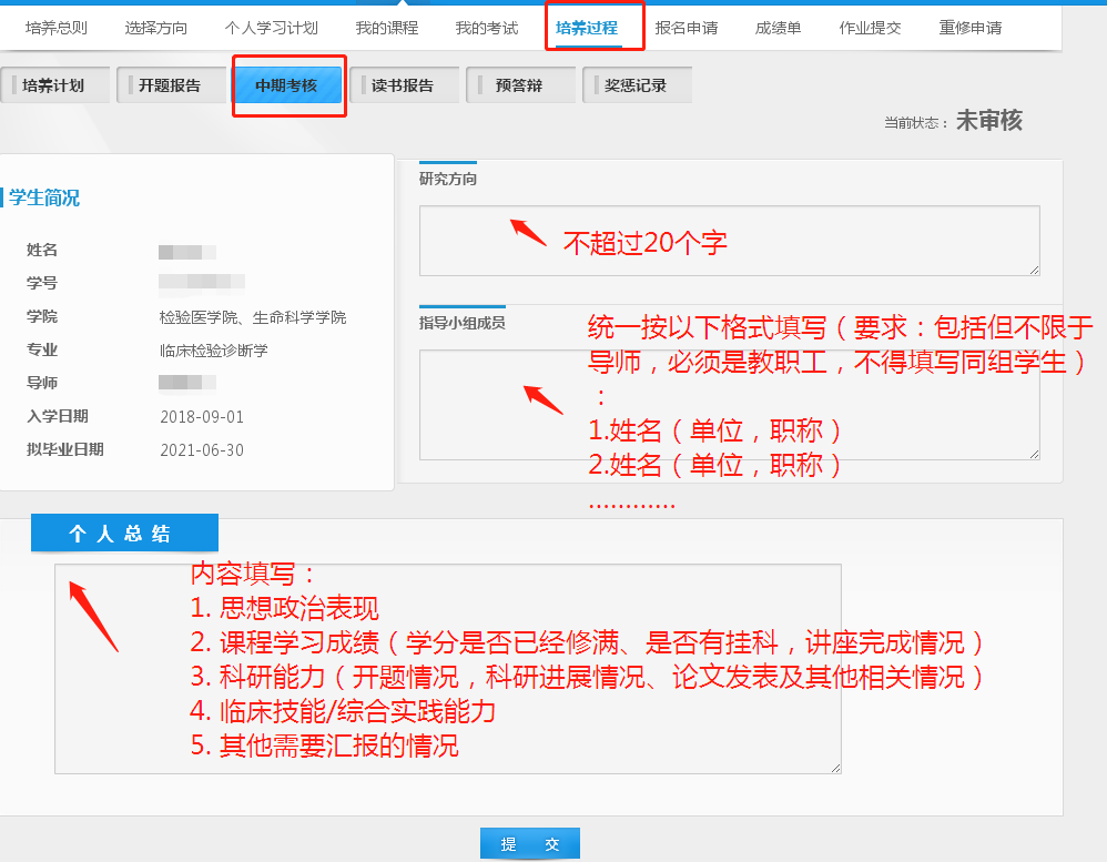 学生自查培养环节完成情况(课程学习,开题,临床轮转,学术报告等),登录“学生服务系统”后在“培养”—“培养过程”—“中期考核”填写研究生个人总结一栏并提交保存(注:学生填写中期考核之前需已在系统中完成培养计划登记及开题报告登记,否则系统无法通过)。