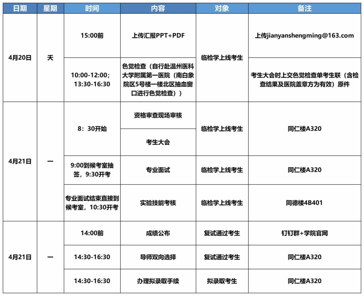所有考生需于4月20日(周日)上午10点至上午12点,下午13:30至下午16:30自行赴温州医科大学附属第一医院(南白象院区)5号楼一楼北区抽血窗口进行色觉检查(考生自行下载检查单并填写个人信息并打印(见附件一),考生自行前往医院检查(无需支付费用),拿回检查单考生联(含检查结果及医院盖章方为有效))完成色觉检查,完成色觉检查后请务必留存好检查单考生联(含检查结果及医院盖章方为有效)原件,请于请于4月21日(周一)现场报到资格审查时将色觉检查单考生联(含检查结果及医院盖章方为有效)原件上交。