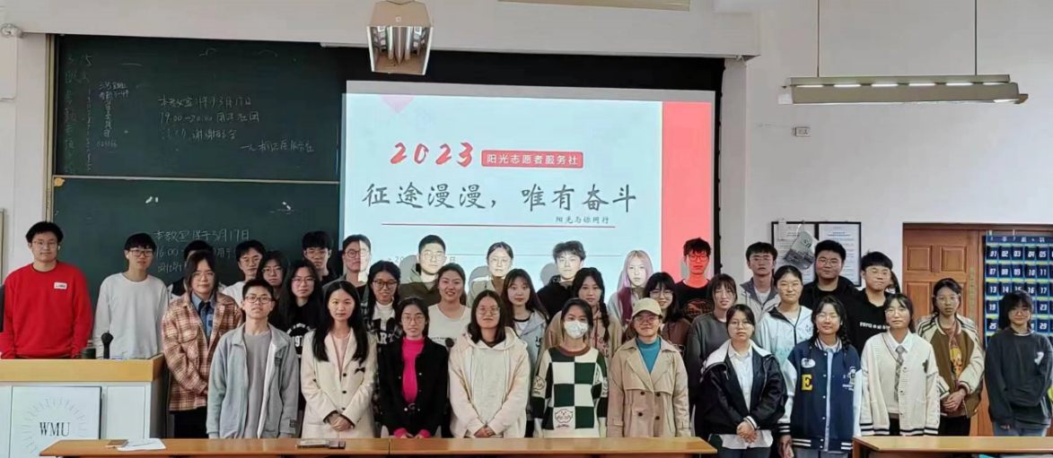 阳光志愿者服务社召开2022-2023学年期初社员大会,指导老师金智博、社长夏婷婷等四位理事以及全体社员共47人与会。