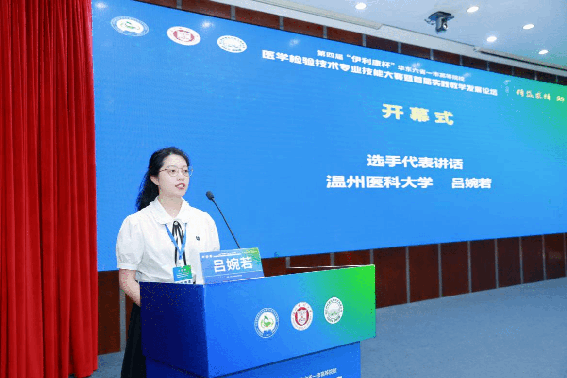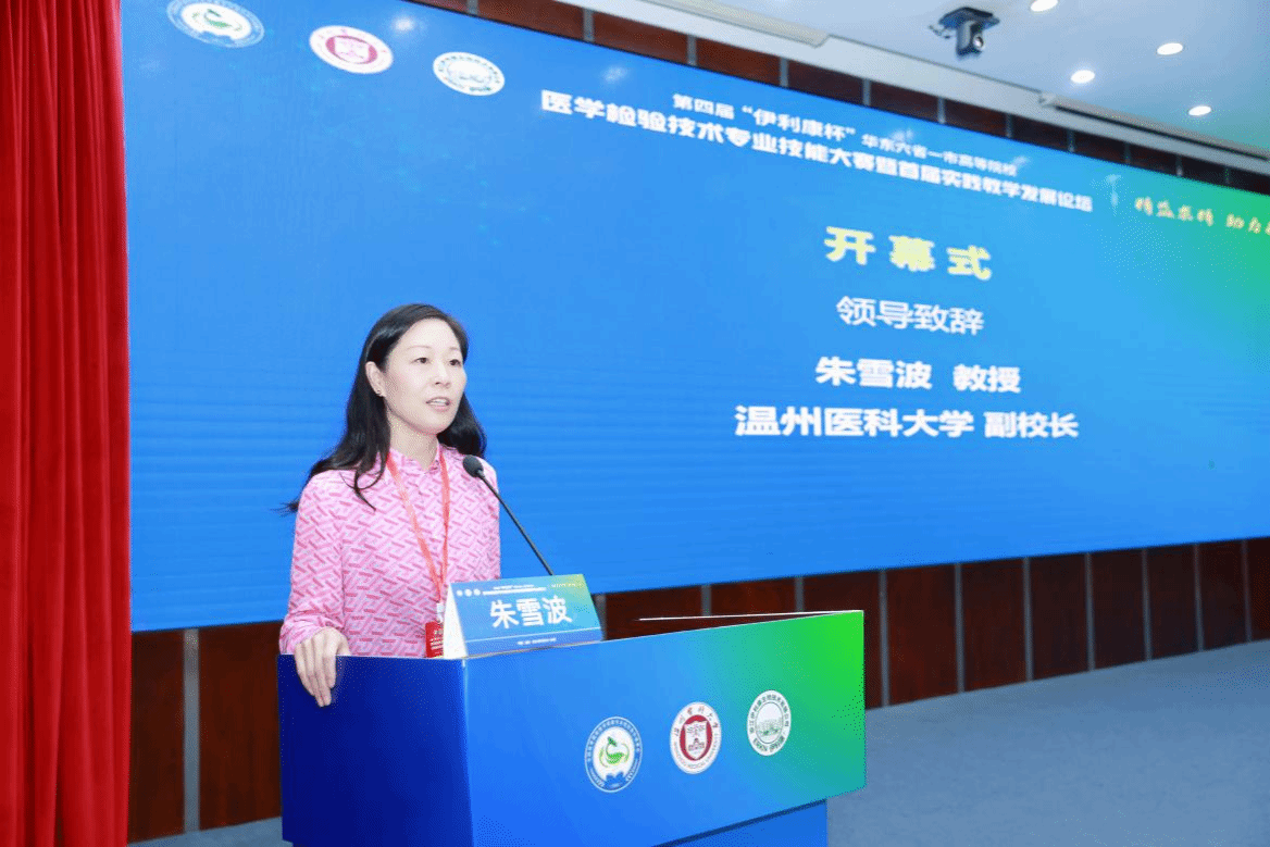 温州医科大学副校长、党委委员朱雪波教授致欢迎词,她表示,温州医科大学始终秉承“仁肃勤朴、求是奋发”的校训,把促进学生的健康成长、培养学生的创新思维、探索学生实践技能作为人才培养和教育教学改革的出发点和落脚点。近年来,学校生源质量稳中有升、学校医学检验技术专业在全国开设高校中排名前5,去年还成为国内首批设立检验医师培养试验班的单位之一,学生也在各项赛事中斩获佳绩。今后,我校将不断深化教育教学改革,以检验技能竞赛为抓手,加大与行业、企业的合作,为培养更多高水平的医学检验人才而努力。为切实践行总书记在二十大报告中提出的“培育创新文化、弘扬科学家精神、涵养优良学风、营造严谨氛围”的指示要求,本届大赛以“精益求精,助力未来”为宗旨,旨在强化学生基本技能培训,培养学生的创新思维,并将部分比赛安排在伊利康生物技术有限公司举行,促进人才培养与行业发展的良性互动。在进行大赛的同时,也将举办首届实践教学发展论坛,希望通过专家、学者的交流研讨、产教融合、科教融汇,为我国的医学检验高质量发展提供新思路和新方法。作为大赛承办单位,我校将严格按照竞赛委员会要求,做好服务保障工作,期待同学们在大赛中增强团队凝聚力、强化创新意识,赛出风格、赛出水平。