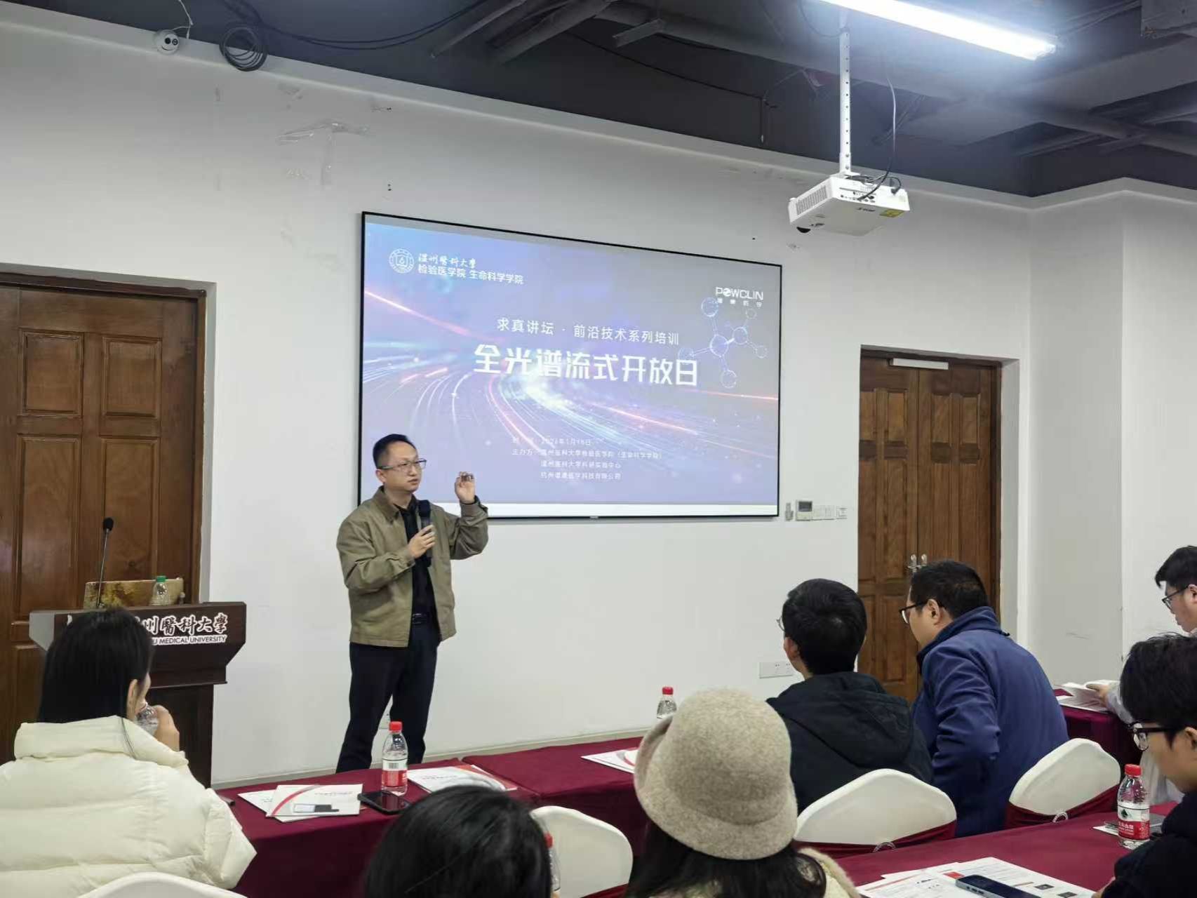 、温州医科大学科研实验中心与杭州谱康医学科技有限公司联合主办的“求真讲坛 • 前沿技术系列培训——全光谱流式开放日”在茶山校区顺利举行。检生学院副院长谢旦立,校科研实验中心运营科副科长郑蒙蒙,杭州谱康医学研发总监李锐、大区经理周春雷莅临现场。本次活动以“细胞因子”为核心,聚焦全光谱流式的理论培训与实操演示,吸引了来自校内外师生及科研工作者的积极参与,共同探索多色流式分析技术的新进展。