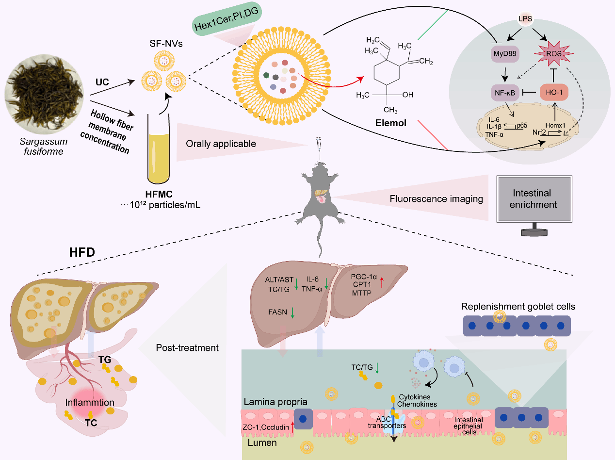 该项研究发现,通过蔗糖梯度超速离心法获得的纳米囊泡(SF-NVs)能够被巨噬细胞高效内吞,并特异性激活细胞内血红素加氧酶-1(HO-1)这一关键抗炎“开关”。同时,SF-NVs通过抑制IKKα/IκBα的磷酸化,阻断炎症核心通路NF-κB的激活,从源头上抑制促炎因子的释放。然而,超速离心法操作繁琐、产量有限,难以满足规模化制备与临床转化的需求。为此,研究团队进一步采用中空纤维膜浓缩法制备了羊栖菜浓缩液(HFMC),该方法操作简便、可放大,具备大规模生产的潜力。研究证实,HFMC中同样富含具有生物活性的羊栖菜纳米囊泡(1012/mL)。在高脂饮食诱导的脂肪肝小鼠模型中,口服HFMC不仅显著减轻了肝脏的脂肪变性与损伤,其作用更体现在一种巧妙的“肠道修复”机制上:它能够抑制高脂饮食引发的慢性肠道炎症,增强肠道黏膜屏障的完整性。通过平息肠道这一炎症“源头”并调节肠道内的脂质水平,HFMC进一步重塑了肝脏的脂质代谢,最终实现了“肠道-肝脏”双靶点、多通路的系统性调控。