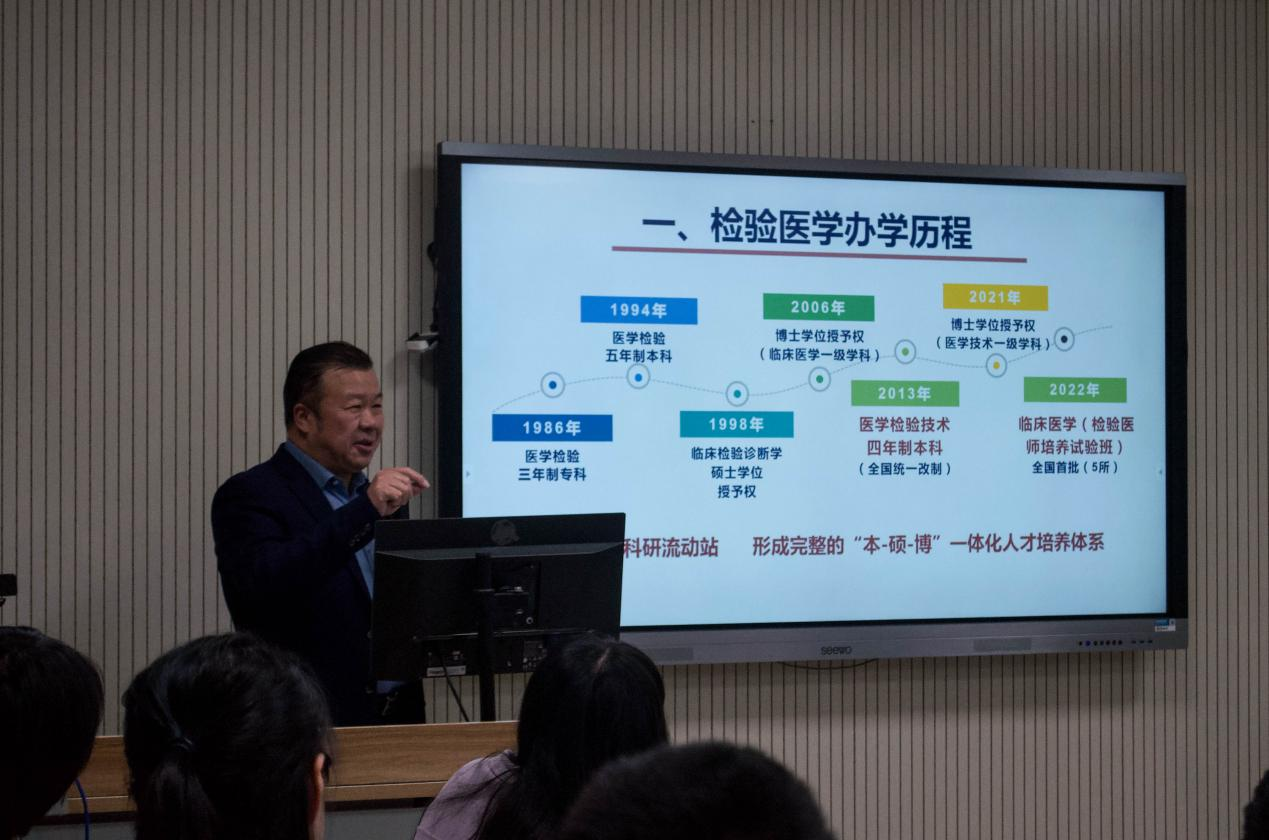 楼永良教授首先带领大家回顾了我校检验医学办学历程,并指出学校临床医学(检验医师培养试验班)是教育部批准成立的首批“检验医师培养试验班”,仅北京大学等五所高水平高校开办。他勉励同学们成为精临床通检验的高层次复合型检验医师,争取成为本领域的领袖人物。在交流过程中,楼教授从临床医学(检验医师培养试验班)专业人才培养的角度进一步交流了“如何度过一个精彩的大学年华”,鼓励同学们去体悟作为医学生的责任担当,希望同学们能成为社会责任感强、专业素养扎实、实践能力突出、创新意识活跃的全能型人才。