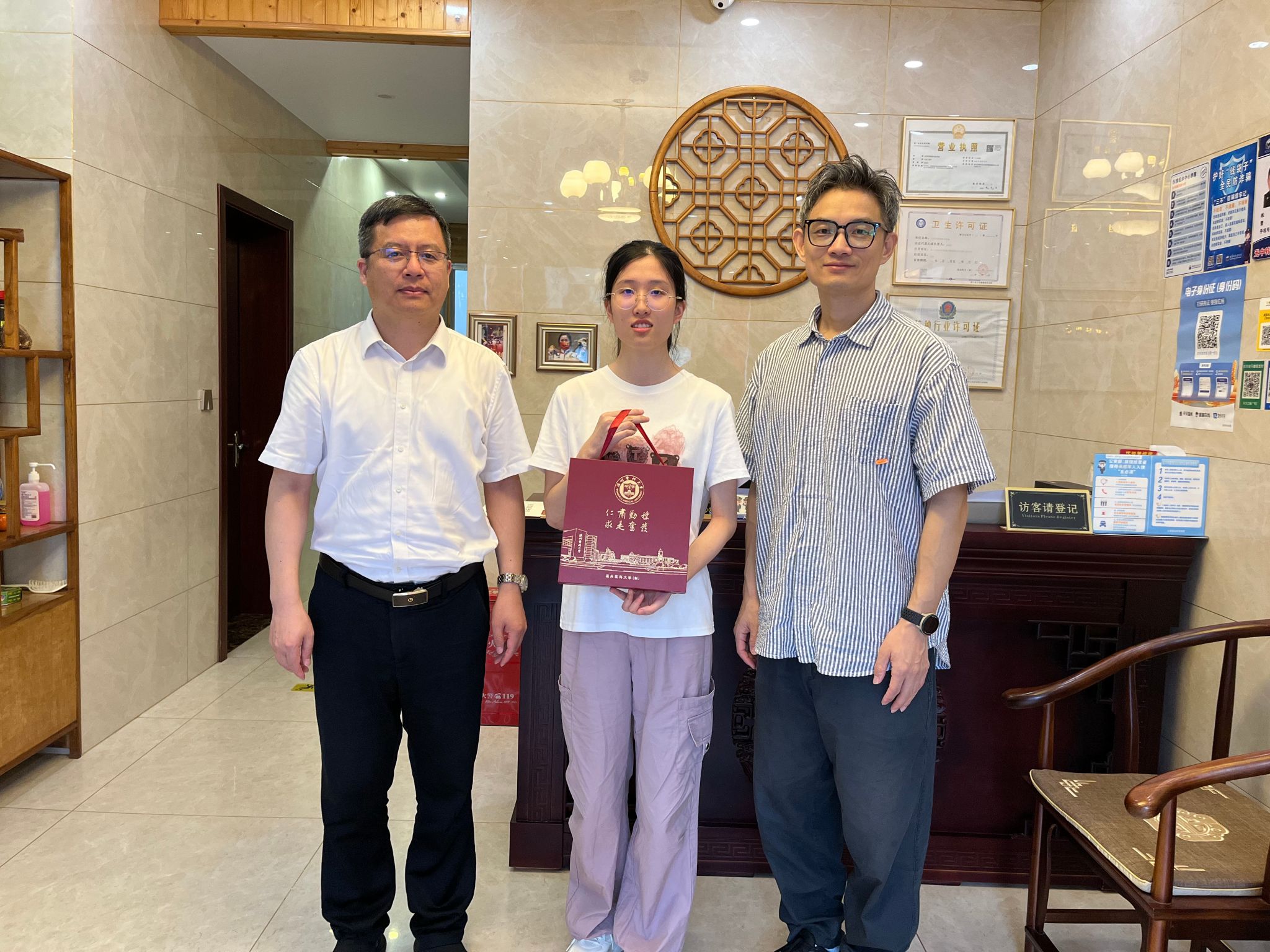 727日上午,大象传媒 2024年首封本科生录取通知书送达温州乐清市,2024级新生金涵希同学从学院院长郑晓群教授、学院党委副书记余信丰老师手中接过了这份特殊的礼物。今年9月,她将进入我校临床医学(检验医师培养试验班)专业学习。