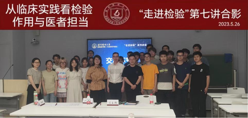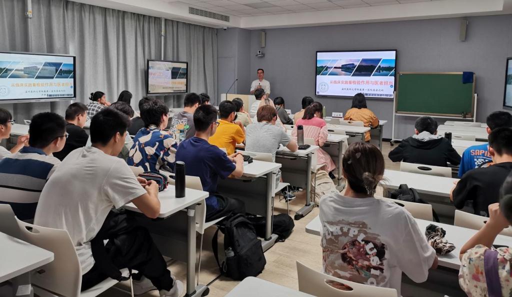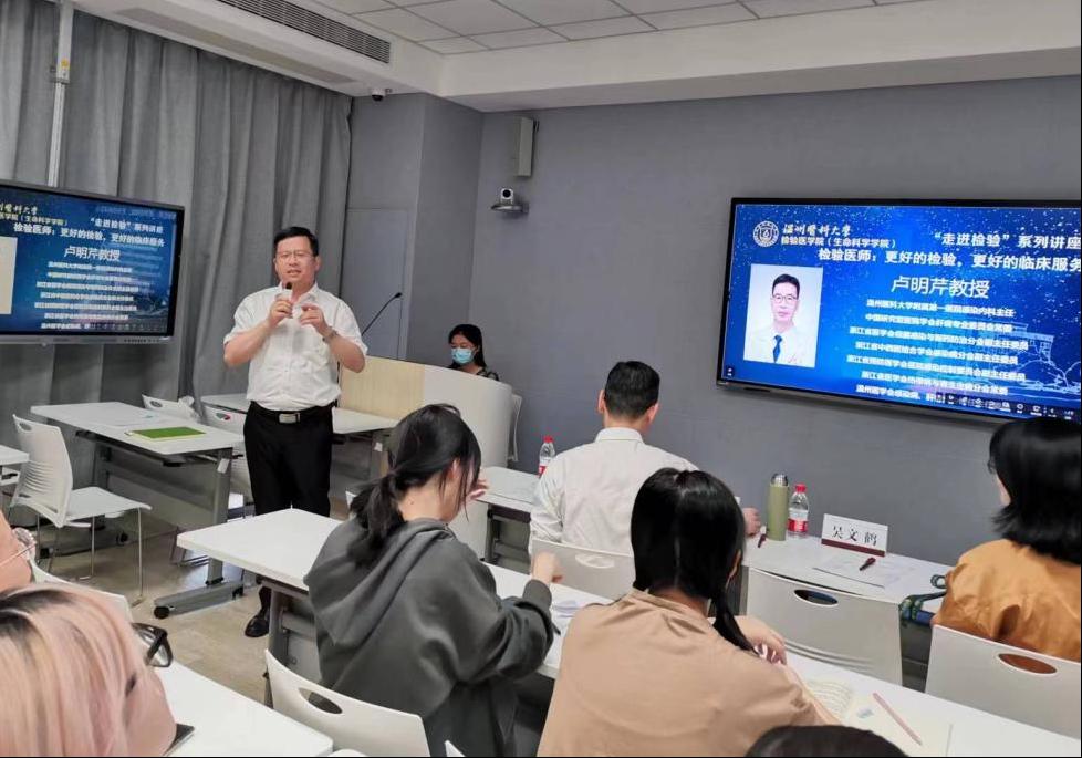 5月26日下午,本学期第七场“走进检验”系列讲座在茶山校区同济楼智慧教室 6A303举行。温州医科大学附属第一医院感染内科主任、中国研究型医院学会肝病专业委员会常委卢明芹教授与2022 级临床医学(检验医师培养试验班)的同学们深入交流,就检验作用、医学和人文本质以及执业医师基础等方面进行了讨论。本次活动由学院执行院长郑晓群教授主持。